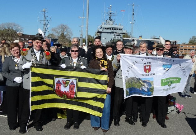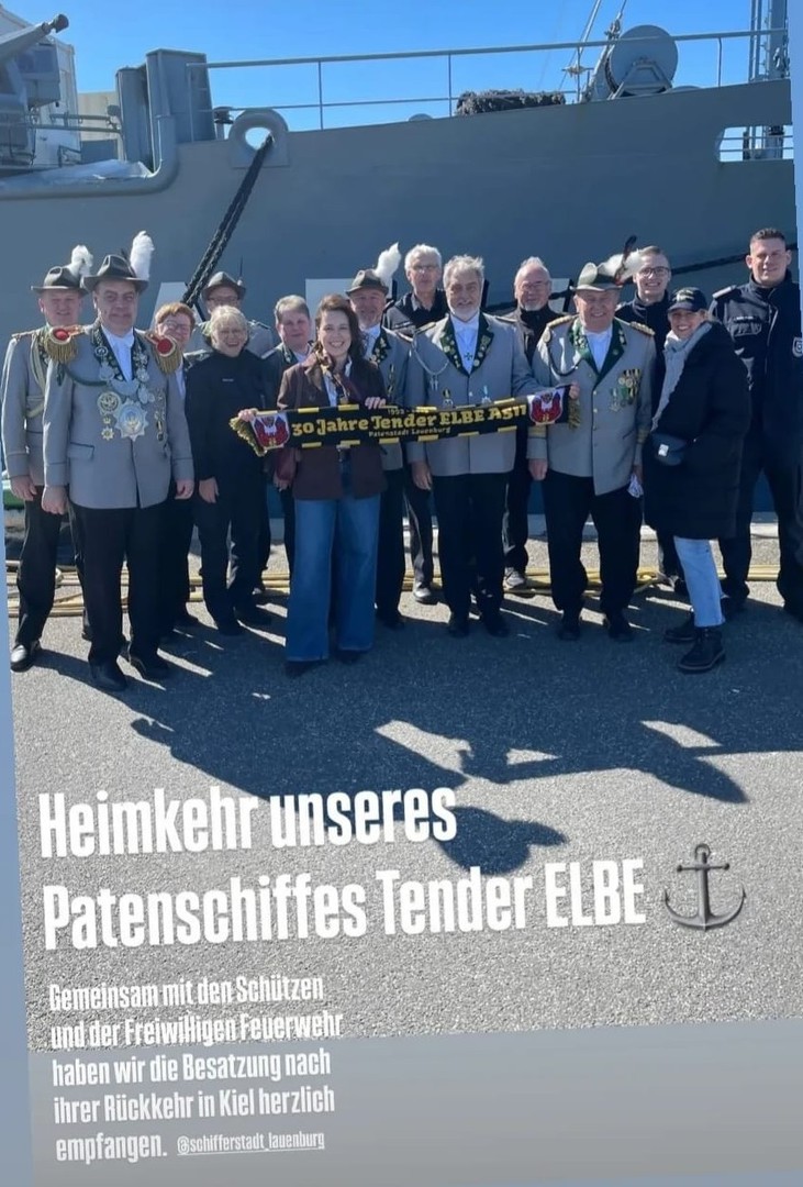 Am 21.04.2026 machte sich eine stattliche Abordnung aus Lauenburg, bestehend aus Mitgliedern der Lauenburger Feuerwehr, der Stadtpräsidentin von Lauenburg und Schützenschwestern und Schützenbrüder der Lauenburger Schützengilde auf den Weg nach Kiel, um das Patenschiff " Tender Elbe" mit seiner Besatzung nach 5 Monaten Einsatz in der Ägäis,herzlich in der Heimat zu begrüßen.