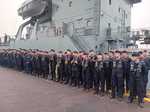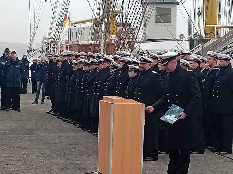 Früh morgens machte sich die Abordnung unter der Leitung unseres Majors Hans-Ulrich Kröppelin auf demWeg. Gemeinsam mit den angetretenen Marineangehörigen und Familienangehörigen der Besatzung, warteten wir bei Glühwein und Brötchen auf "unsere" blauen Jungs und Mädels. Pünktlich um 9:40 Uhr erschien der "Tender Elbe" unter dem Kommando von Korvettenkapitän Sebastian Nacke, aus der Warnow kommend am Horizont. Unter den Klängen des Heeresmusikkorbs Neubrandenburg machte der Tender an der Pier fest.